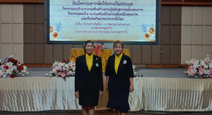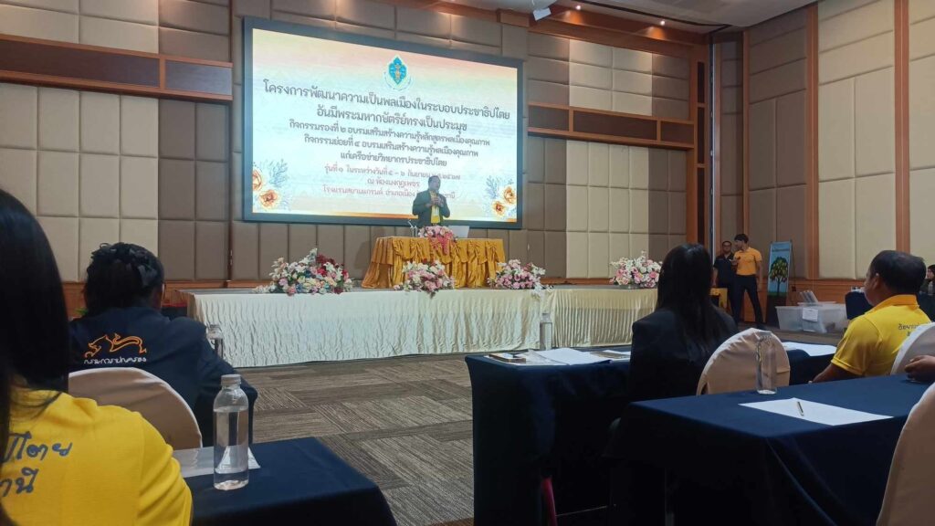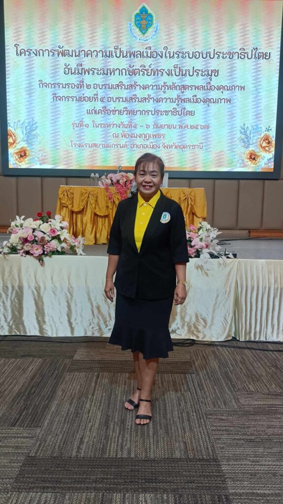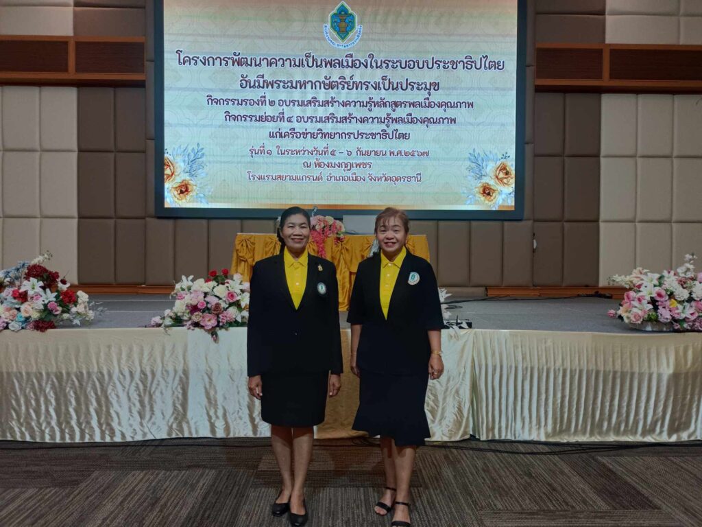 • วันพฤหัสบดี ที่ 5 กันยายน 2567 นายรัชต์ คลังมั่น ครูชำนาญการ รักษาการในตำแหน่งผู้อำนวยการ สกร.ระดับอำเภอประจักษ์ศิลปาคม มอบหมายให้นางมนิดา หรเสริฐ ตำแหน่ง ครู และนางสาวพิสมัย แก้วไชย ตำแหน่ง ครูอาสาสมัคร เข้าร่วมโครงการพัฒนาความเป็นพลเมืองในระบอบประชาธิปไตยอันมีพระมหากษัตริย์ทรงเป็นประมุขกิจกรรมรองที่ 2 อบรมเสริมสร้างความรู้หลักสูตรพลเมืองคุณภาพกิจกรรมย่อยที่ 4 อบรมเสริมสร้างความรู้พลเมืองคุณภาพแก่เครือข่ายวิทยากรประชาธิปไตย รุ่นที่ 1 ในระหว่างวันที่ 5-6 กันยายนพ.ศ 2567ณ ห้องมงกุฎเพชร โรงแรมสยามแกรนด์ อำเภอเมืองอุดรธานี จังหวัดอุดรธานี